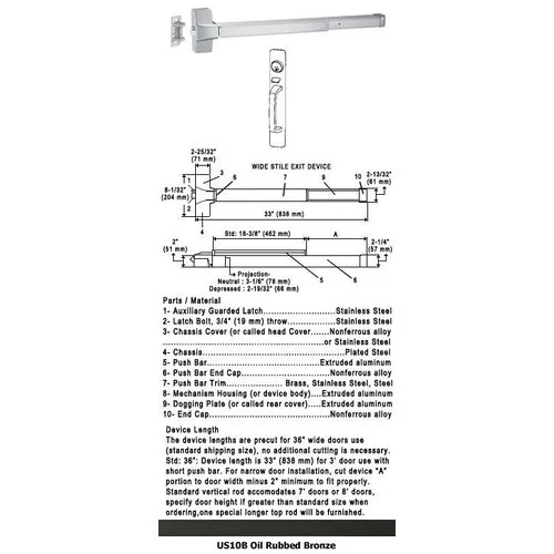 International Door Closers 8810S-36 ANSI Grade 1 Commercial Push Bar Rim Mount Panic Hardware With Exterior Locking Thumbpiece Pull Plate Trim. Designed for heavy traffic applications. Suitable for use with wide stile (minimum 4-1/4″) or flat surface aluminum, hollow metal or wood 1-3/4″ Thick doors. Non-Handed and Reversible UL and ULC Listed Panic Hardware. Fits single doors 30″ – 36″ Wide (cut bar to fit) and up to 96″ in Height. Hex key dogging. Includes outside pull plate trim #87P-5A Classroom (key locks and unlocks thumbpiece). US10B Oil Rubbed Bronze Finish.